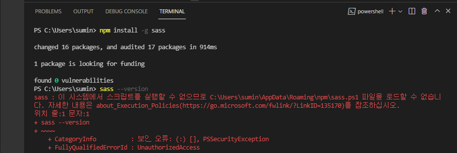 VSCode에서 Sass를 터미널로 설치하던 도중, 해당 에러 발생.