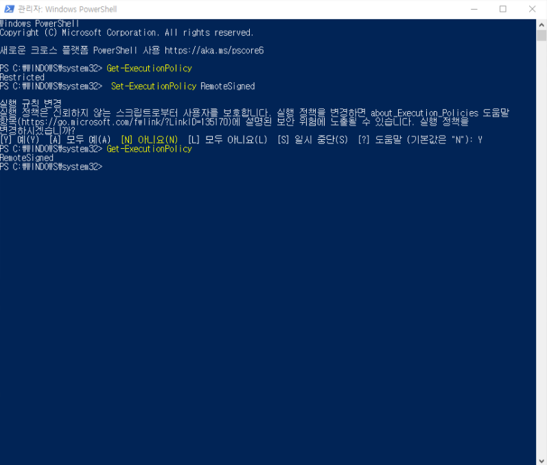 - 결과값이 RemoteSigned가 아닐 경우, Set-ExecutionPolicy RemoteSigned 입력.