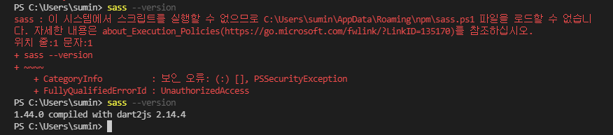 이 시스템에서 스크립트를 실행할 수 없으므로 C:\Users\유저명\AppData\Roaming\npm\sass.ps1 파일을 로드할 수 없습니다. 자세한 내용은 about_Execution_Policies(https://go.microsoft.com/fwlink/?LinkID=135170)를 참조하십시오.