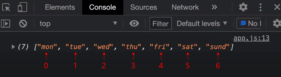 Array 안의 데이터에 접근하고 싶다면 변수명(daysOfWeek)을 적어주고 대괄호 안에 얻고싶은 항목 번호를 넣음.